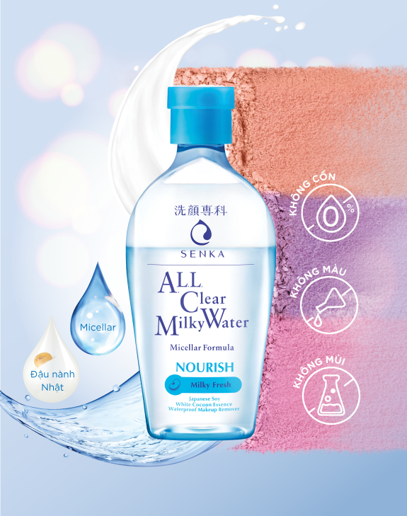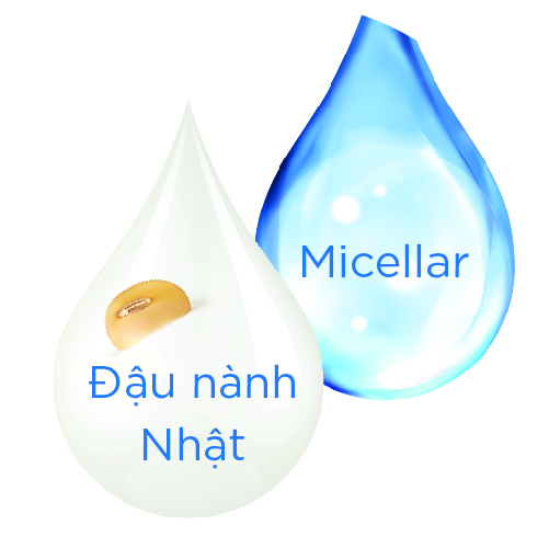 Kết cấu nước tẩy trang MICELLAR + SỮA tẩy trang chiết xuất Đậu Nành Nhật Bản - đột phá Mới mỏng nhẹ, không nhờn dính, mang lại DỊU NHẸ khi tẩy trang, dễ dàng hòa tan và làm sạch kể cả cặn trang điểm không trôi mà không cần chà xát.