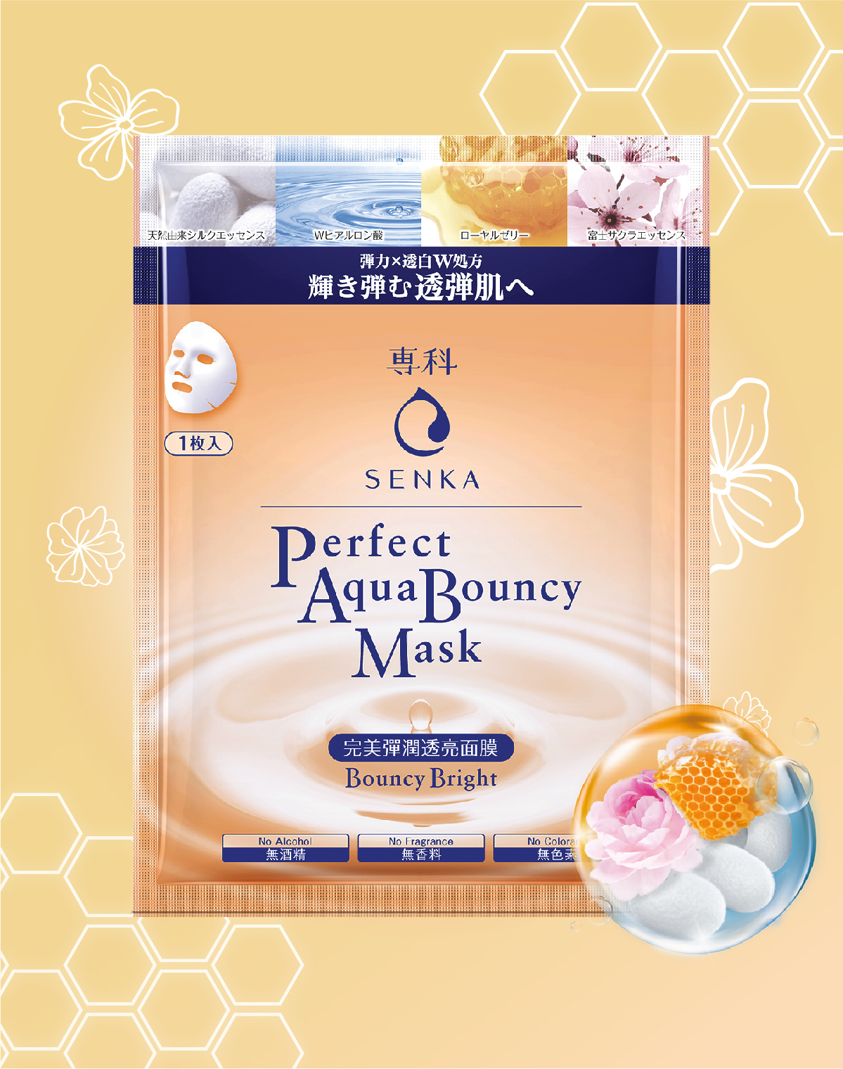 Với thành phần chiết xuất sữa ong chúa, tinh chất hoa anh đào, cam thảo, phức hợp tinh chất tơ tằm thiên nhiên và gấp đôi Hyaluronic Acid, mặt nạ Senka Perfect Aqua Bouncy Bright giúp cung cấp và phục hồi độ ẩm, nuôi dưỡng làn da ẩm mịn & mềm mượt trong nhiều giờ liền.