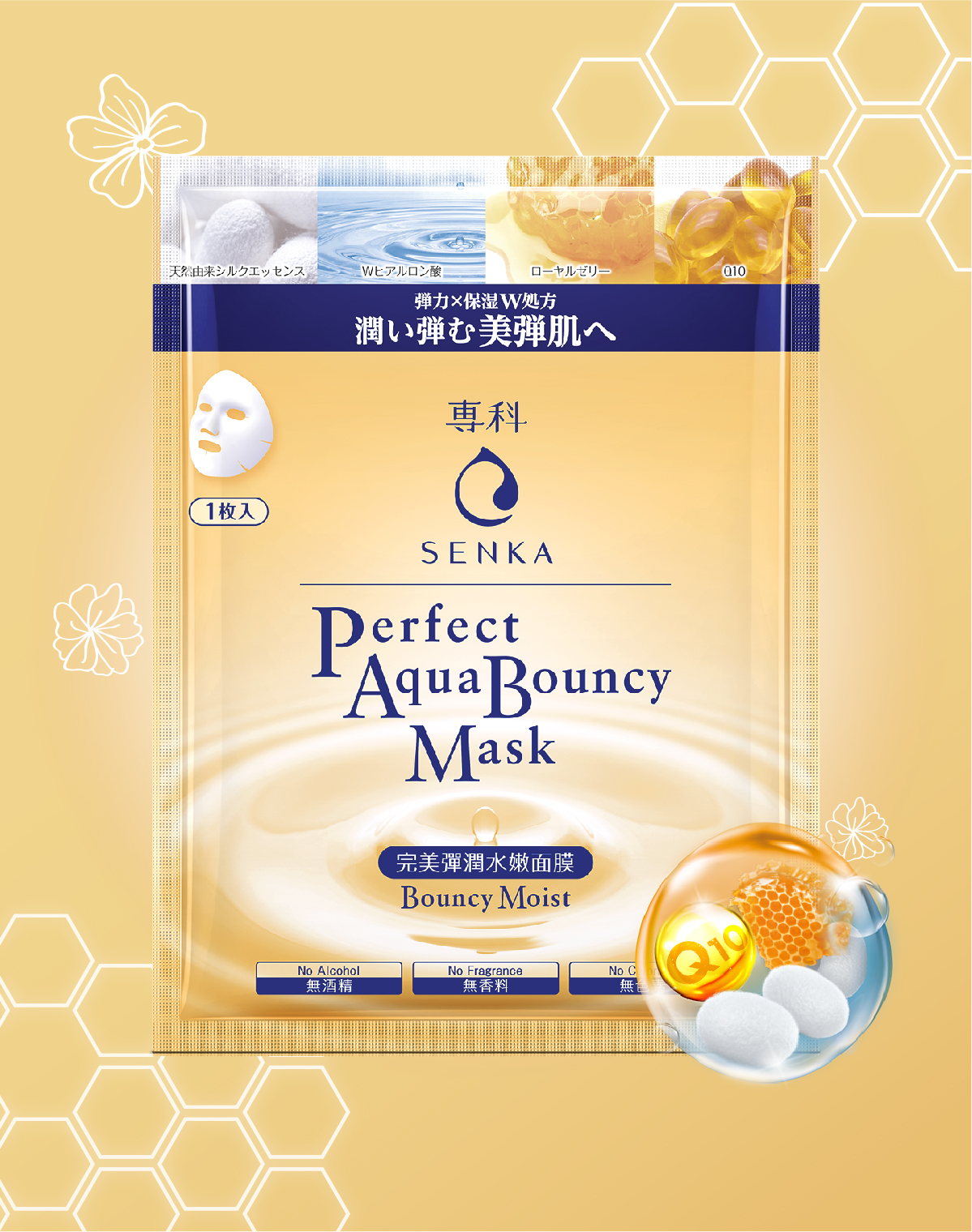 Với chiết xuất Q10 và mật ong Manuka quý hiếm, mặt nạ Senka Perfect Aqua Bouncy Moist giúp cung cấp độ ẩm cho làn da căng mọng tức thì, kết hợp với tinh chất dưỡng sáng da, từ đó mang lại làn da tươi sáng rạng rỡ và đàn hồi, ngăn ngừa các dấu hiệu lão hóa sớm.